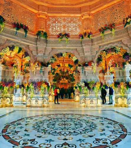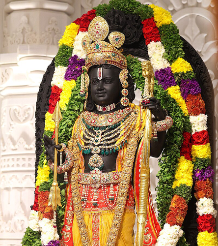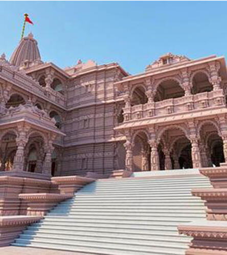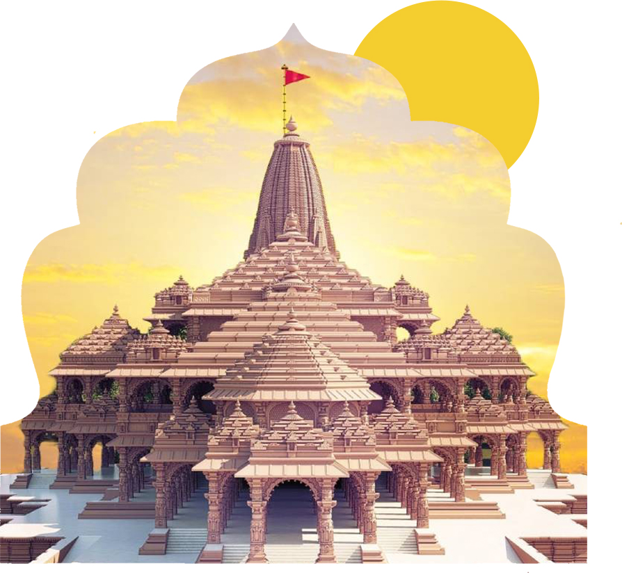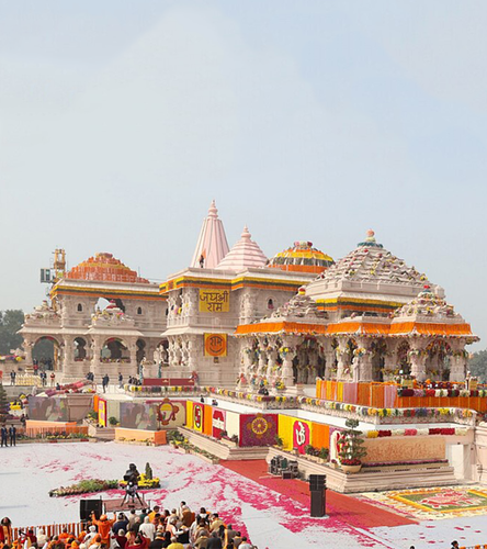The Ram Mandir (ISO: Rama Maṁdira, lit. ’Rama Temple’) is a partially constructed Hindu temple complex in Ayodhya, Uttar Pradesh, India. Many Hindus believe that it is located at the site of Ram Janmabhoomi, the mythical birthplace of Rama, a principal deity of Hinduism. The temple was inaugurated on 22 January 2024 after a prana pratishtha (consecration) ceremony.